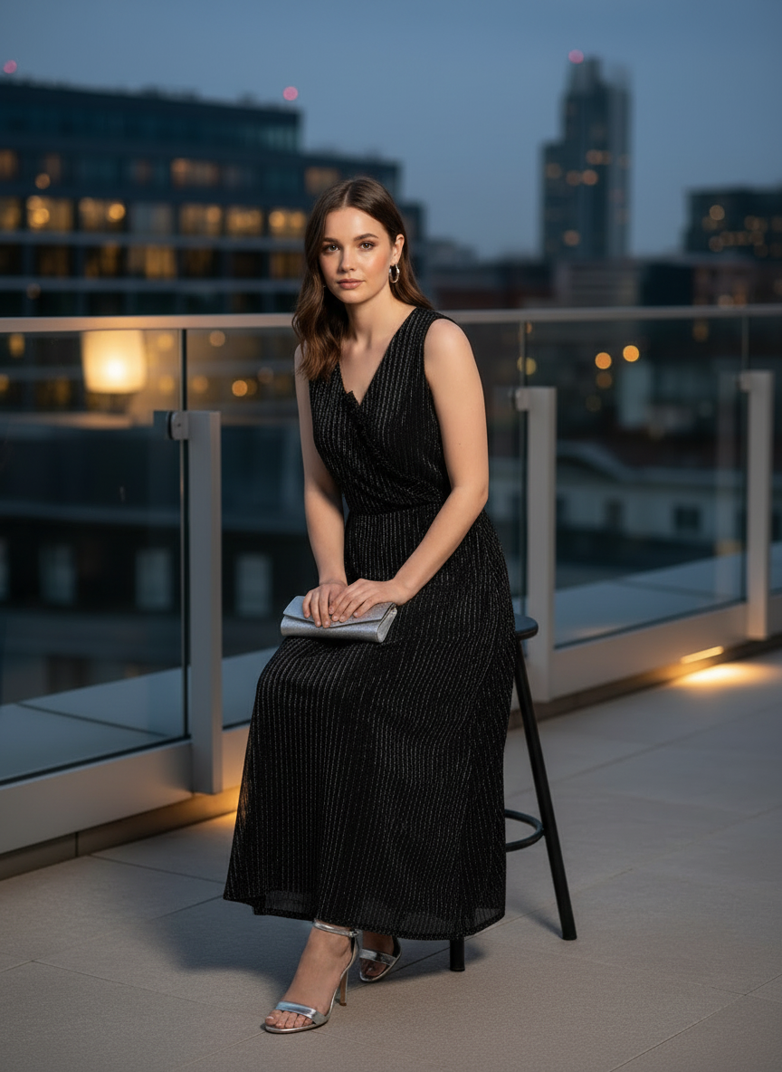 Elevate your evening wardrobe with this sophisticated One Piece Maxi Dress in classic black. Crafted from premium Lurex Lycra fabric, this dress combines luxurious shimmer with exceptional stretch and comfort. The fluid maxi silhouette flatters all body types while the lustrous Lurex finish catches light beautifully, making it perfect for formal occasions, celebrations, or upscale events. The Lycra blend ensures a second-skin fit that moves with you, delivering both elegance and wearability throughout the night.